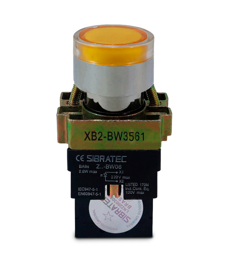 A Sibratec dispõe uma linha completa de botões de pulso. Os botões de pulso com iluminação Sibratec são pertencentes a linha XB2, qual utilizam o mesmo bloco de contato, vide especificações abaixo. O padrão de furação é de 22mm, possui grau de proteção IP40.