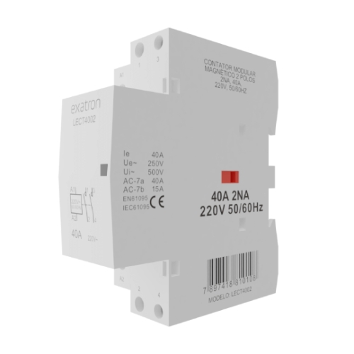 O Contator Modular (LECT4002) da Exatron é utilizado em circuitos de comando de carga de iluminação, climatização, bombeamento, aquecimento e motores elétricos. O contator pode ser facilmente integrado com relés, timers, sensores de presença, programadores e outras soluções de automação, proporcionando controle, precisão e segurança dos sistemas elétricos.