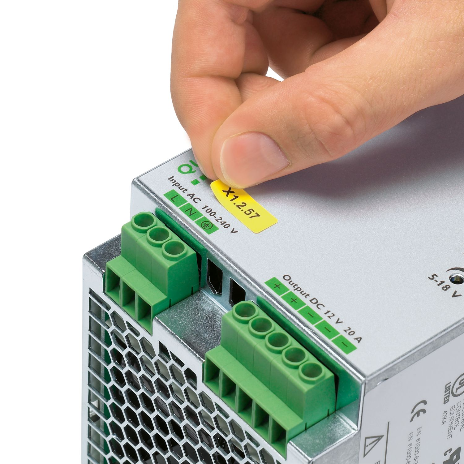 Os marcadores em forma de esteiras uniformes podem ser impressos com rapidez e a custos acessíveis, servindo para identificação de equipamentos na construção de controladores, instalações e quadros de comando. As etiquetas pré-perfuradas podem ser facilmente separadas e montadas, e as esteiras oferecem espaço para textos de função em campos de projeto. Em combinação com as fitas de impressão de alta qualidade obtém-se uma etiquetagem resistente para ambientes hostis.